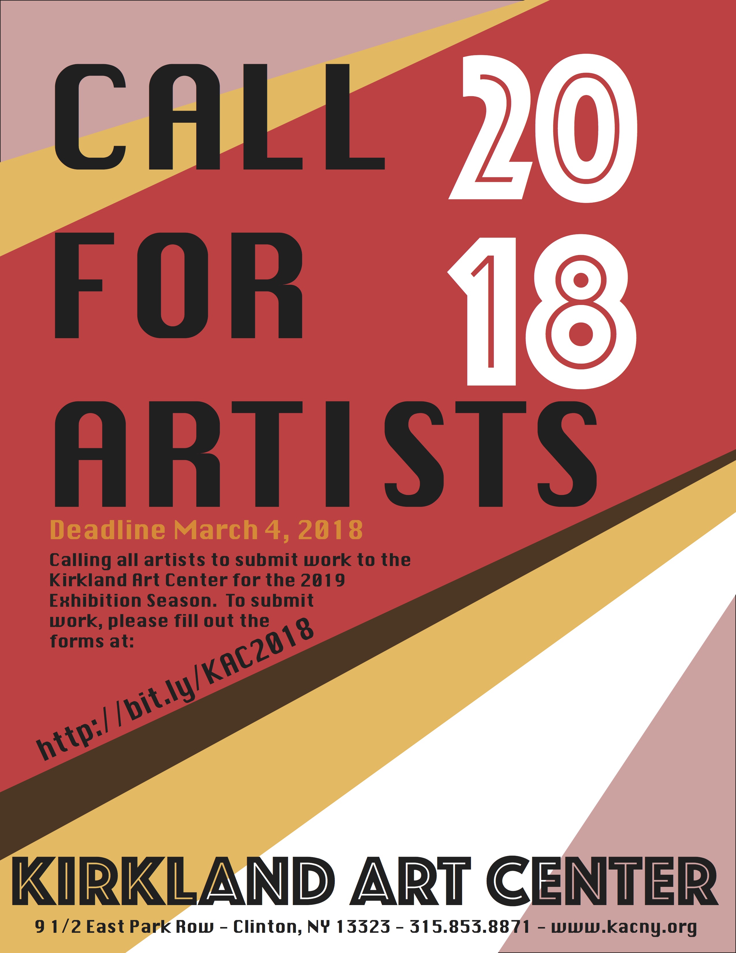 Calling artists in all media to submit work for the 2019 Exhibition Season at the Kirkland Art Center in Clinton, NY. Artists will be selected for group or solo exhibition by a committee of local artists, educators and museum professionals. For more information and to submit, please go to http://bit.ly/KAC2018 or http://www.kacny.org/call-for-entries
