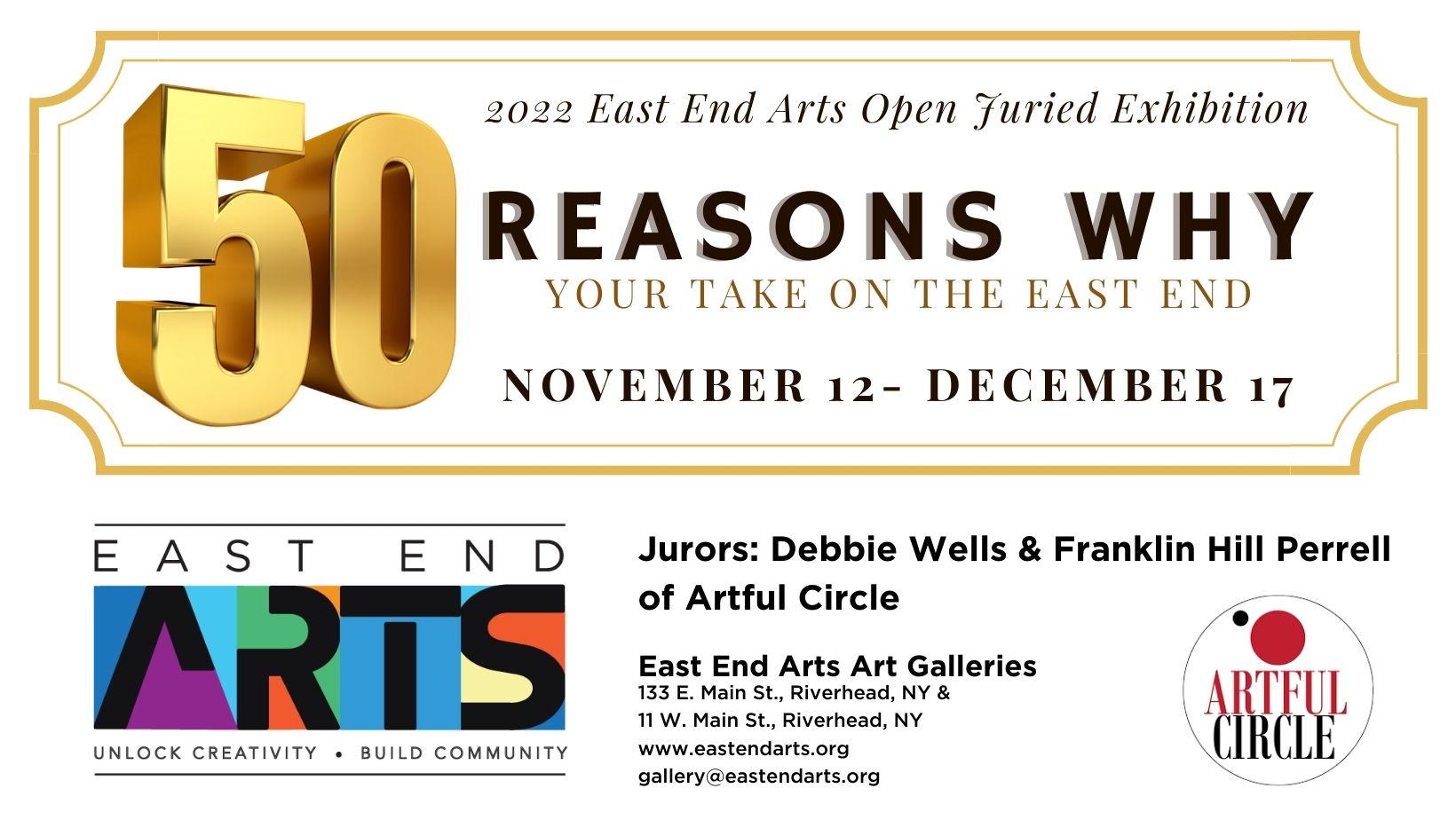 This art exhibition welcomes all mediums and provides artists the opportunity to showcase works that depict your feelings about the East End of Long Island. To celebrate East End Art's 50th year, the jurors Debbie Wells & Franklin Hill Perrell of Artful Circle will select fifty pieces that they feel best convey the artists' intentions and show originality of visions.