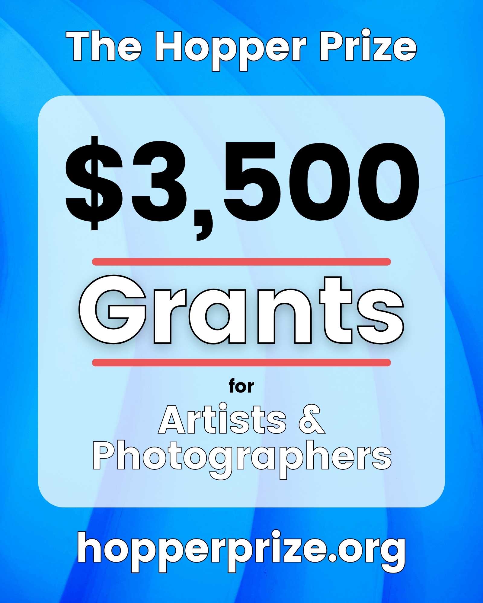 The Hopper Prize is now accepting entries for our Fall 2023 artist grants. We are offering grants in the amount of $3,500 (2 available) and $1,000 (4 available) to artists & photographers worldwide working in all media. In total, 6 artists will receive unrestricted cash grants totaling $11,000.