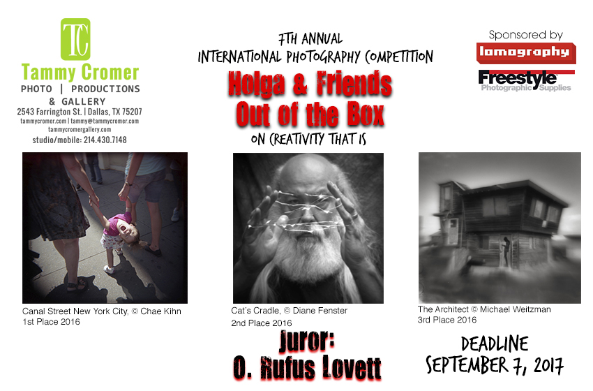 The Holga & Friends Out of the Box International Photography Exhibition opens at Tammy Cromer Photography Gallery, 2543 Farrington St., Dallas, TX 75207 - in the Dallas Design District ! Lomography and Freestyle are sponsoring the exhibit. Both will help us publicize it. Lomography will give the 1st place winner a camera package. Freestyle will give 3 cameras to the award winners. We are on the web at http://tammycromer.com/Artist.asp?ArtistID=44895&Akey=6FJX86WC&ajx=1#!asset70249