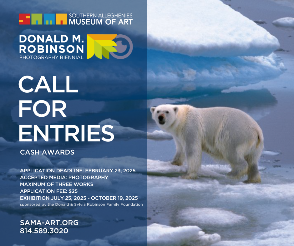 Southern Alleghenies Museum of Art in Bedford, PA is pleased to announce we are now accepting applications for the Donald M. Robinson Photography Biennial 2025 juried exhibition. The Robinson Biennial is a juried exhibition attracting photographers from across the nation to be on display at SAMA Bedford from Friday, July 25, 2025 through Sunday, October 19, 2025. The exhibition and events are sponsored by the Donald & Sylvia Robinson Family Foundation and Benzel's Bretzel Bakery Inc.