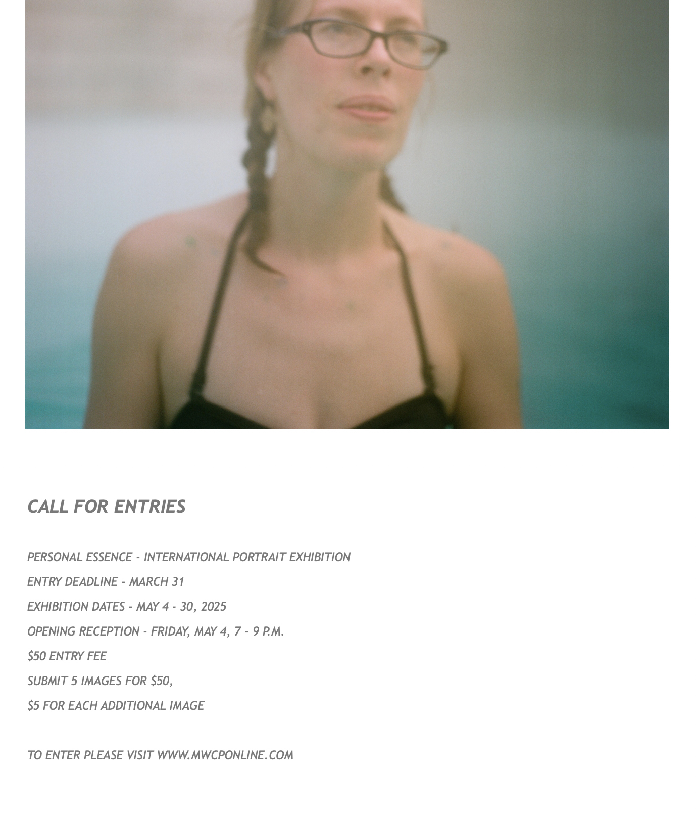 To enter: Submit .jpeg images to the gallery via email, and follow the online instructions found on our website at https://www.mwcponline.com/peronal-essence-entry.html. Please note that there is not an image upload form and simply email .jpegs to the gallery email address.