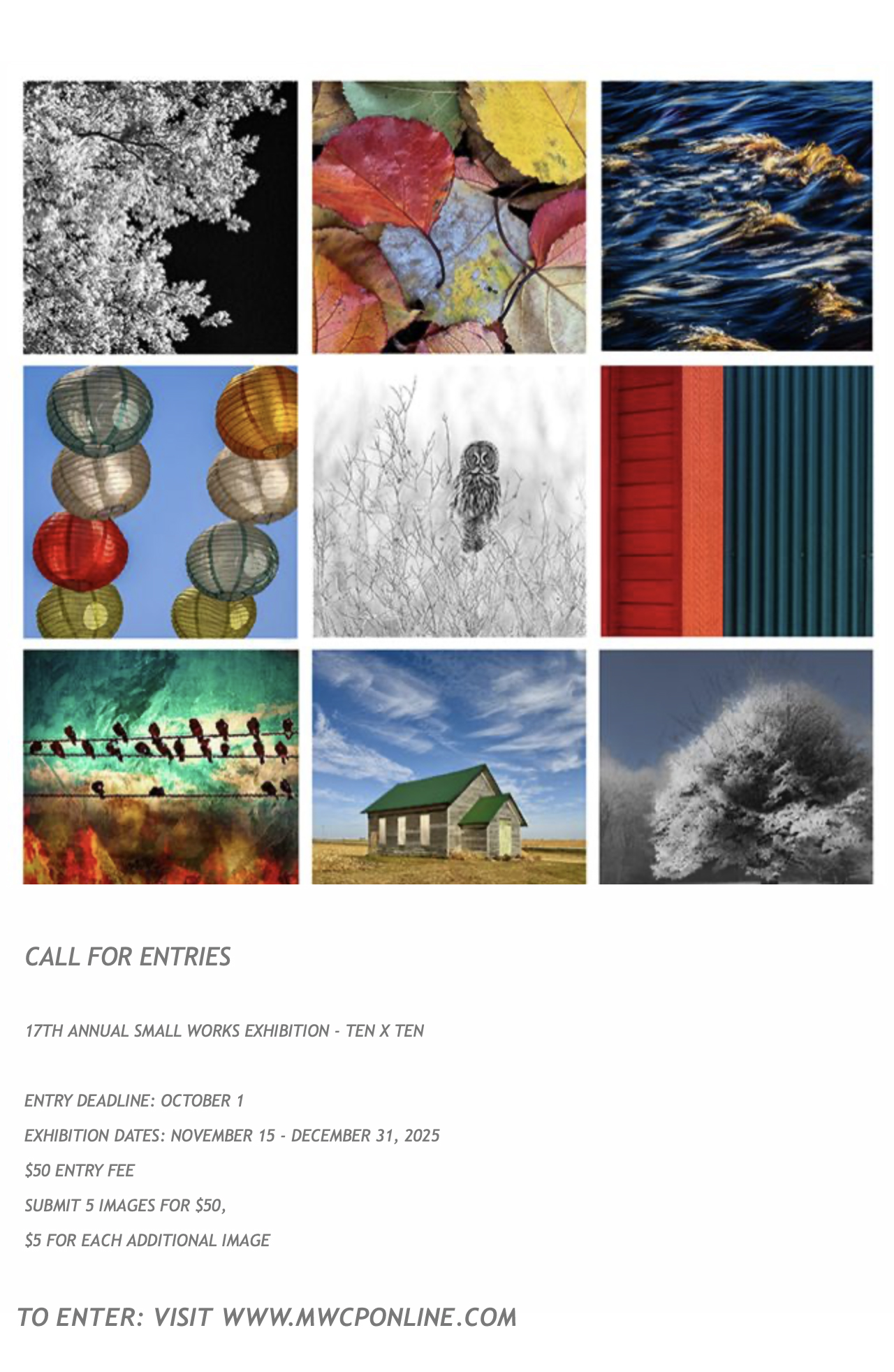 To enter: Please visit https://www.mwcponline.com/ten-x-ten-entry.html and follow the online instructions. Please note there is not an image upload form and simply send .jpeg images to the Midwest Center for Photography via email.