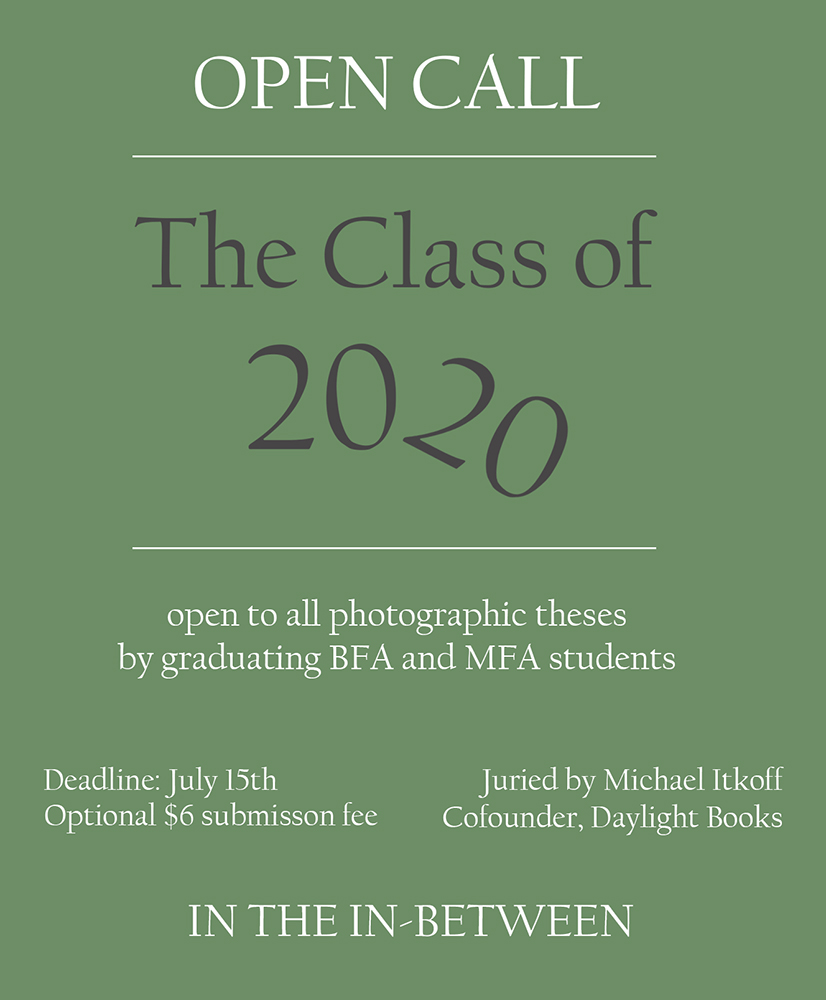 In the In-Between announces an open call for photographic work by graduating students whose thesis exhibitions were canceled or drastically altered as a result of the pandemic closures. Work selected from this call will be included in an online group exhibition, The Class of 2020. This call is designed to support the next generation emerging contemporary photographers and shed light on important new work that offers fresh, informed perspectives on our world now. This call is open to all photographic genres, styles, and techniques, and we strongly encourage artists from underrepresented communities to submit. This exhibition will be juried by Michael Itkoff, Cofounder of Daylight Books.