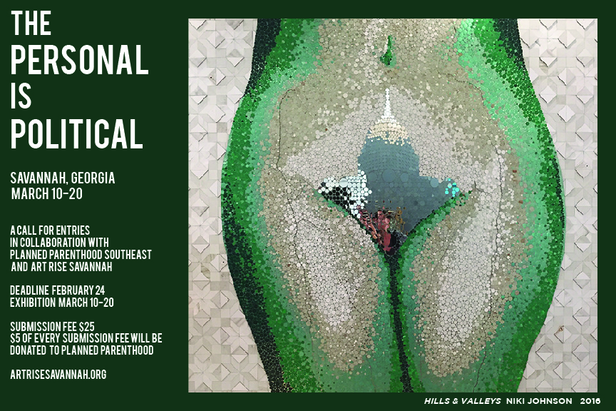 We are now seeking submissions for The Personal is Political, opening March 9th, 2017 with a private fundraising event benefiting Planned Parenthood Southeast. This call is open to artists of all gender identities, racial and economic backgrounds living across the globe. Consideration will be given to all mediums and dimensions. $5 of each submission fee will go to benefit Planned Parenthood Southeast. See FAQ information below for further details.