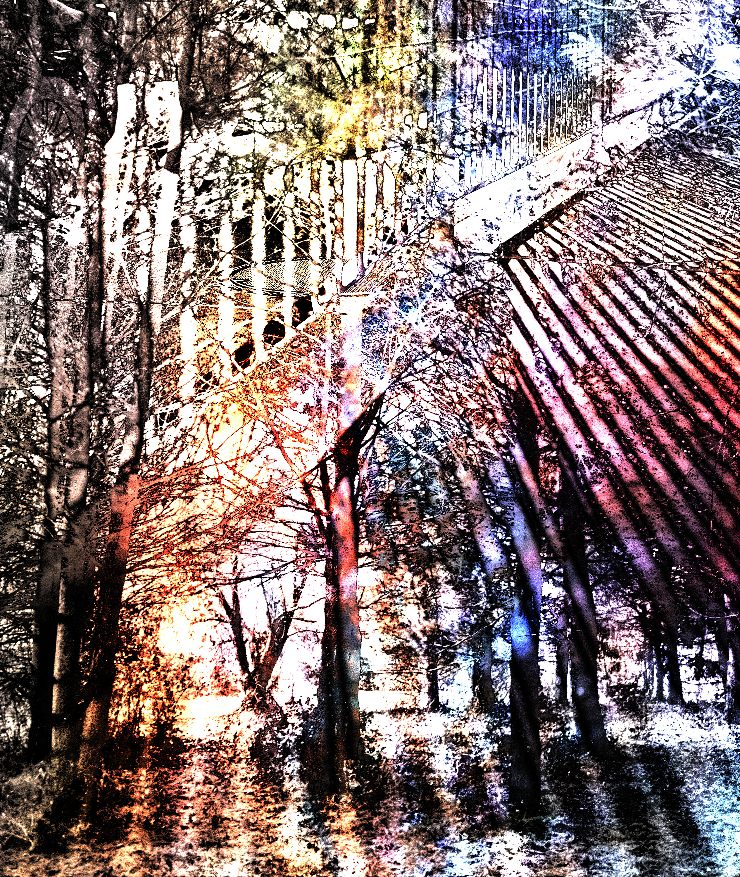 This image is a composite of multiple forest scenes layered into one fragmented space. Tree trunks, branches, and a railing overlap, disrupting perspective and creating a sense of instability. Saturated, shifting colors move away from realism, emphasizing the manipulated nature of the image. By combining these elements, the forest becomes less a place and more a reflection of distortion and disorientation.