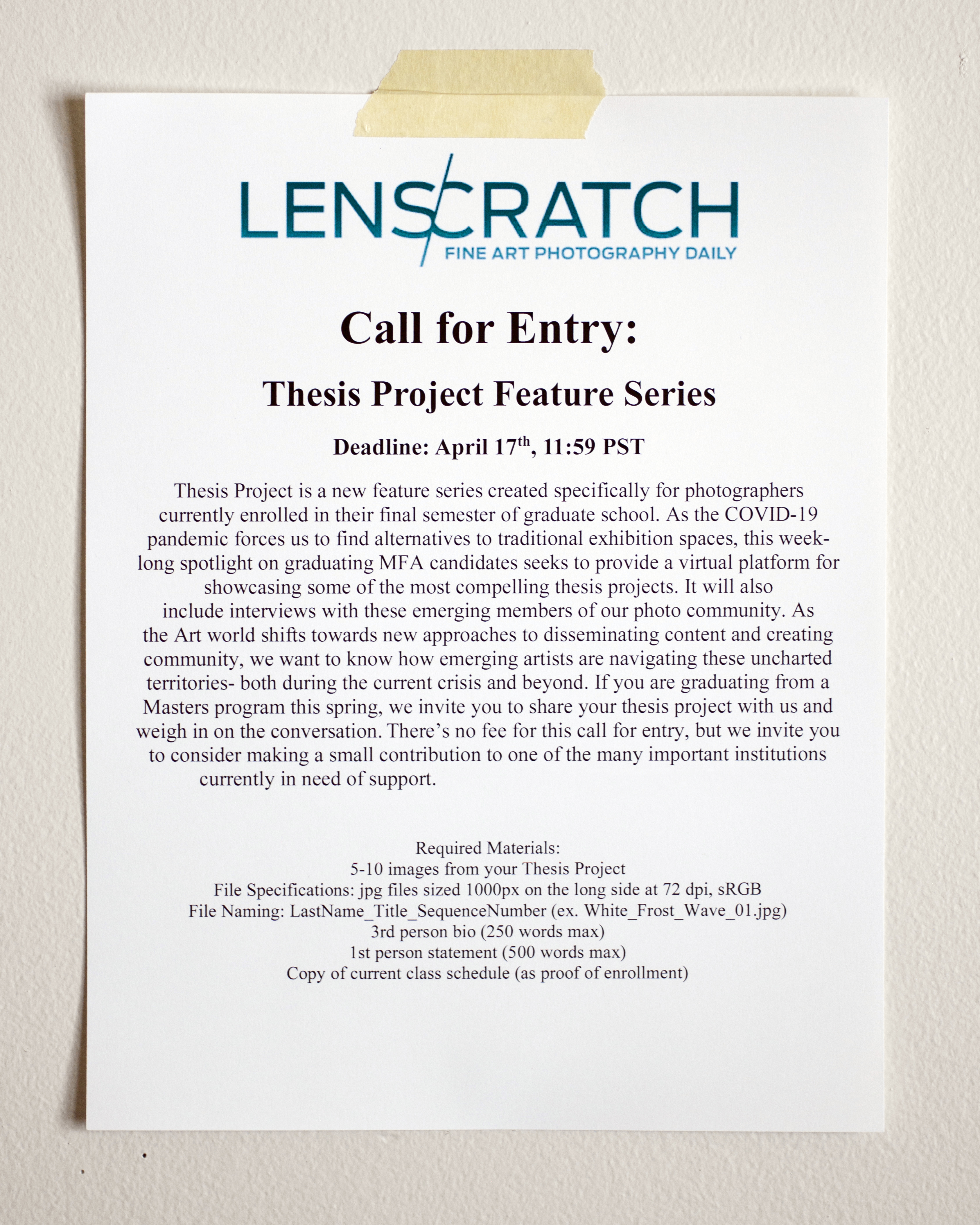Thesis Project is a new feature series created specifically for photographers currently enrolled in their final semester of graduate school. As the COVID-19 pandemic forces us to find alternatives to traditional exhibition spaces, this week-long spotlight on graduating MFA candidates seeks to provide a virtual platform for showcasing some of the most compelling thesis projects. It will also incorporate interviews with these new members of our photo community. As the art world shifts towards new approaches to disseminating content and creating community, we want to know how the next generation is navigating these uncharted territories- both during the current crisis and beyond. If you are graduating from a masters program this spring, we invite you to share your thesis project with us and weigh in on the conversation.