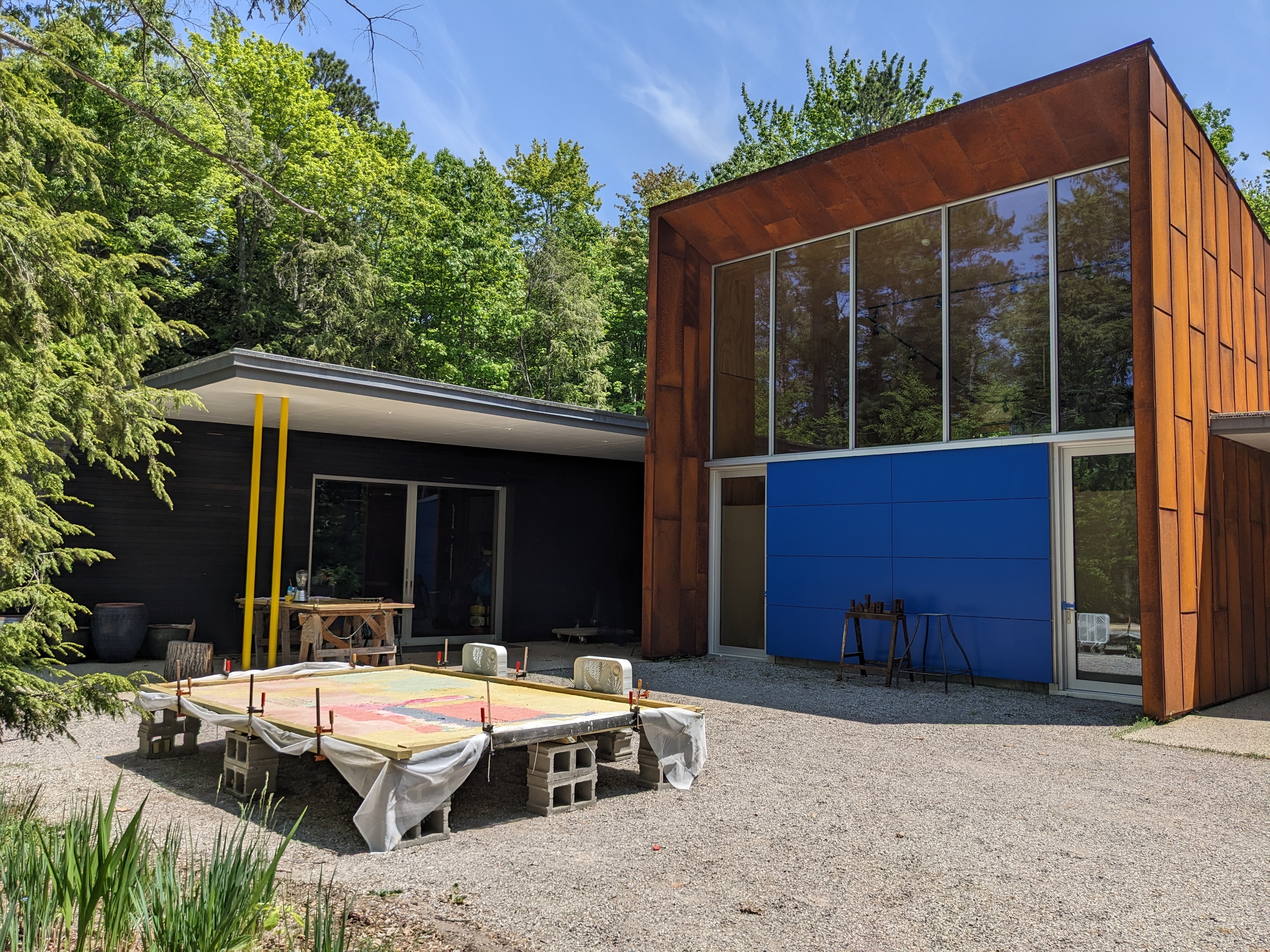 Tusen Takk was designed to host one resident at a time, or two in collaboration, for residencies between three and eight weeks. Artists-in-residence are provided with housing, 24/7 access to the Foundation's Studios, an honorarium of $625/week, a vehicle for local transportation, and access by appointment to the Founder's library and collection. Artists are highly encouraged to engage the regional arts community once when in residence; in the past, artists have hosted a private workshop or studio visit, given a public presentation or performance, or mounted an exhibition of their work. Studios include a woodshop, painting studio, 63" Glimakra floor loom, etching studio, digital print lab, and darkroom.